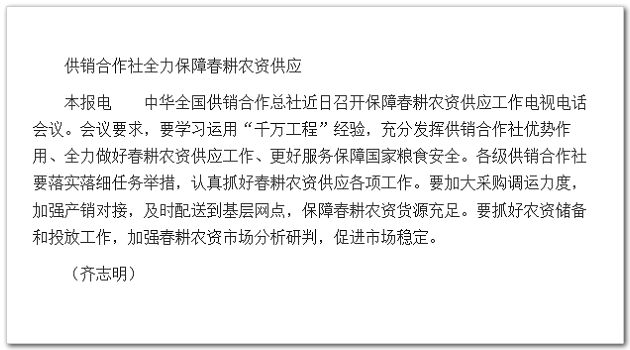 中華全國供銷合作總社近日召開保障春耕農(nóng)資供應(yīng)工作電視電話會(huì)議。會(huì)議要求,要學(xué)習(xí)運(yùn)用“千萬工程”經(jīng)驗(yàn),充分發(fā)揮供銷合作社優(yōu)勢作用、全力做好春耕農(nóng)資供應(yīng)工作、更好服務(wù)保障國家糧食安全。各級供銷合作社要落實(shí)落細(xì)任務(wù)舉措,認(rèn)真抓好春耕農(nóng)資供應(yīng)各項(xiàng)工作。要加大采購調(diào)運(yùn)力度,加強(qiáng)產(chǎn)銷對接,及時(shí)配送到基層網(wǎng)點(diǎn),保障春耕農(nóng)資貨源充足。要抓好農(nóng)資儲(chǔ)備和投放工作,加強(qiáng)春耕農(nóng)資市場分析研判,促進(jìn)市場穩(wěn)定。